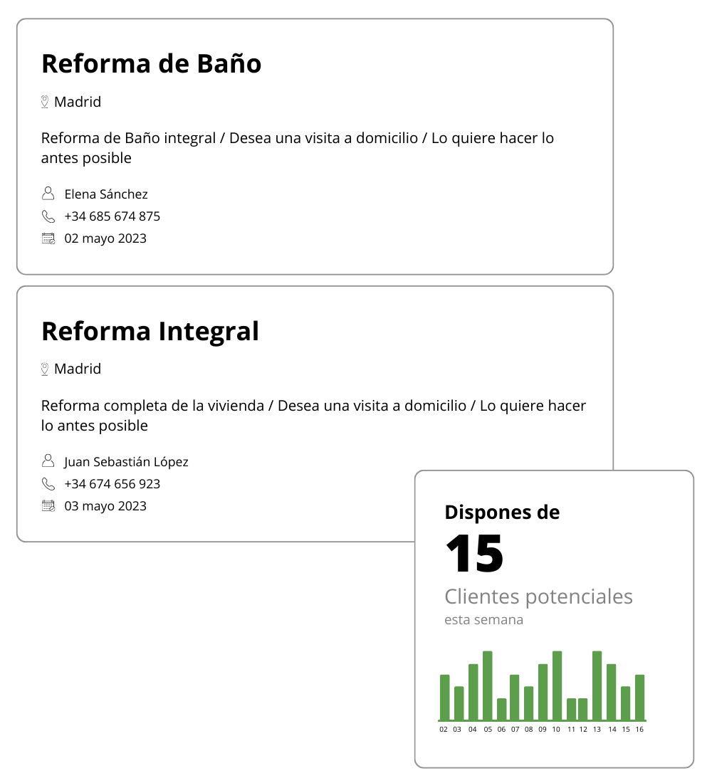 Todo es muy simple. Conseguimos clientes potenciales y compartimos contigo aquellos que están de verdad interesados a realizar cualquier tipo de reforma en su vivienda.