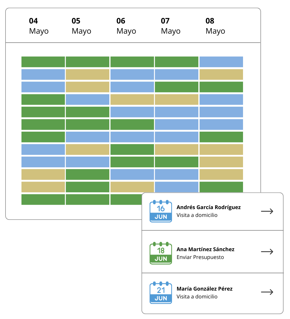 No te preocupes más por tener un calendario vacío. A partir de ahora, gracias a nuestra solución, podrás llenar tu agenda con llamadas a nuevos contactos, visitas a clientes potenciales para establecer un primer contacto con ellos, la creación y envío de presupuestos y la gestión de proyectos para cerrar tratos exitosos.